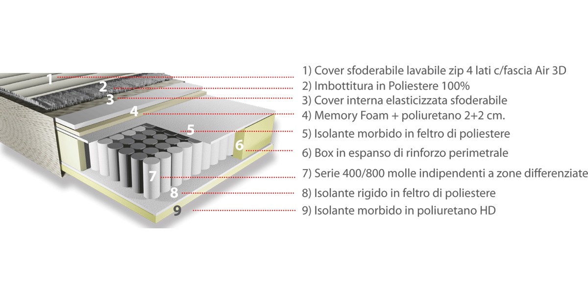 Materasso a molle indipendenti Pocket serie 400 singolo 800 matrimoniale, zone differenziate con molle di diverso spessore.