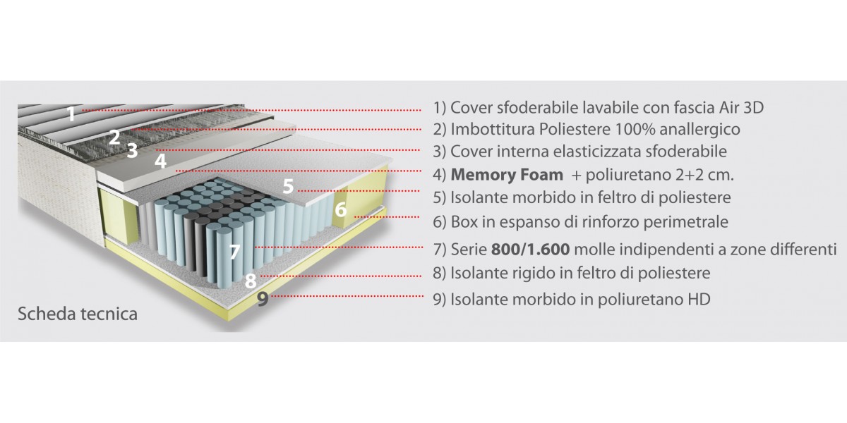 Materasso con micro-molle indipendenti MicroPocket serie 800 singolo 1.600 matrimoniale, zone differenziate di diverso spessore.